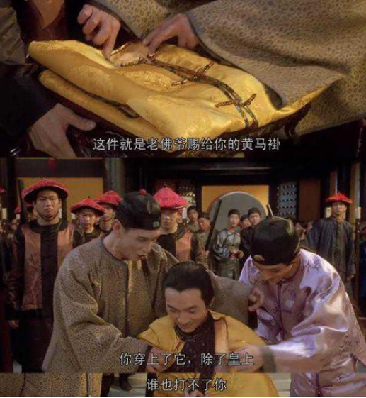 在周星驰的电影《九品芝麻官》中黄马褂有保护的作用,除了皇上谁也不能打,在康熙微服私访和武训传等电影也有赏穿黄马褂的记载。那么马褂是怎么由来的呢?